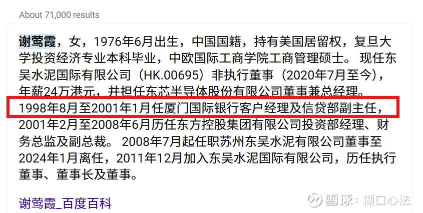 另外一个神秘人物此时闪亮登场,就是在老蒋第一次炒股赚钱,和爆仓破产的时候都任职厦门银行的谢美女。1998年她才22岁,复旦大学毕业结识了当年风头正盛的蒋学明,2005,她29岁了,危难时刻不离不弃。怪不得目前能坐上东芯股份的总经理。