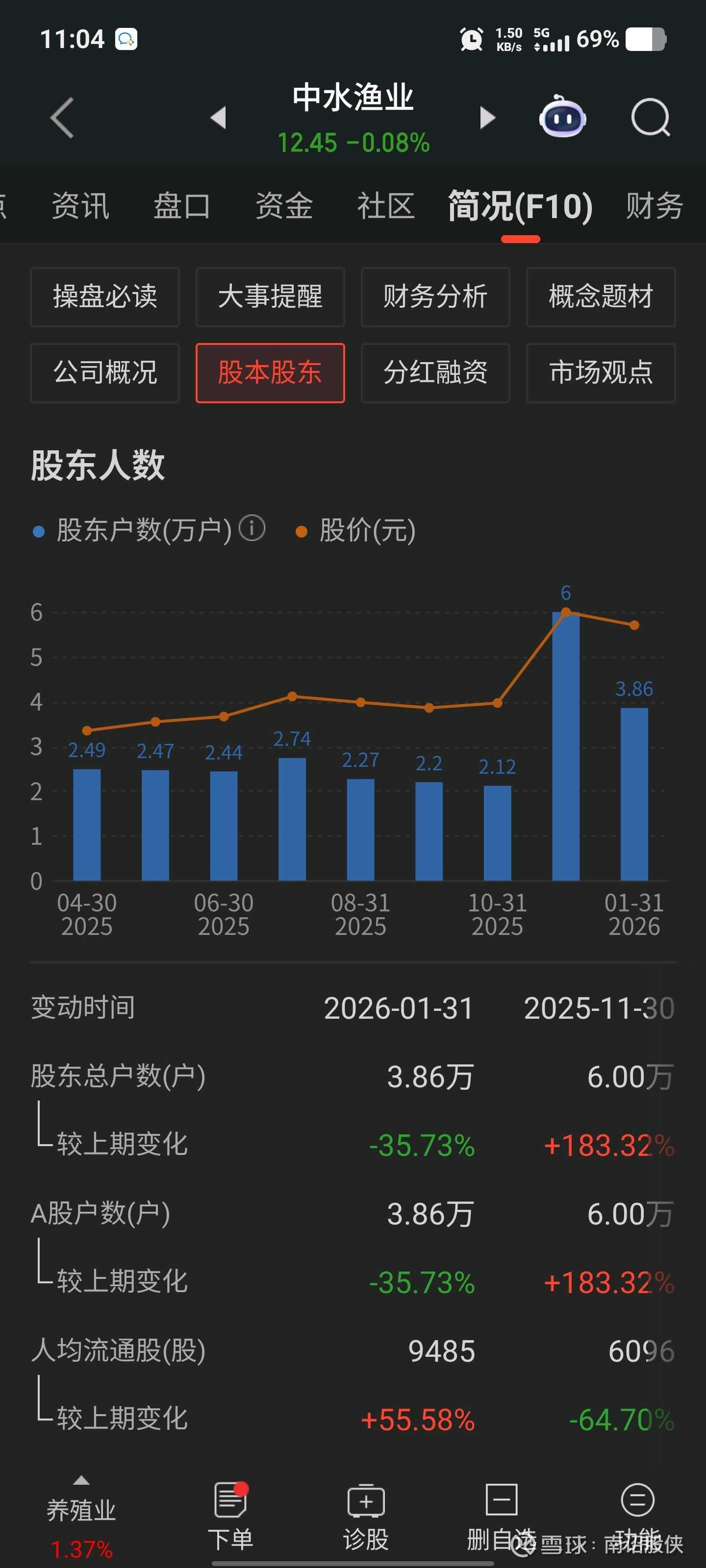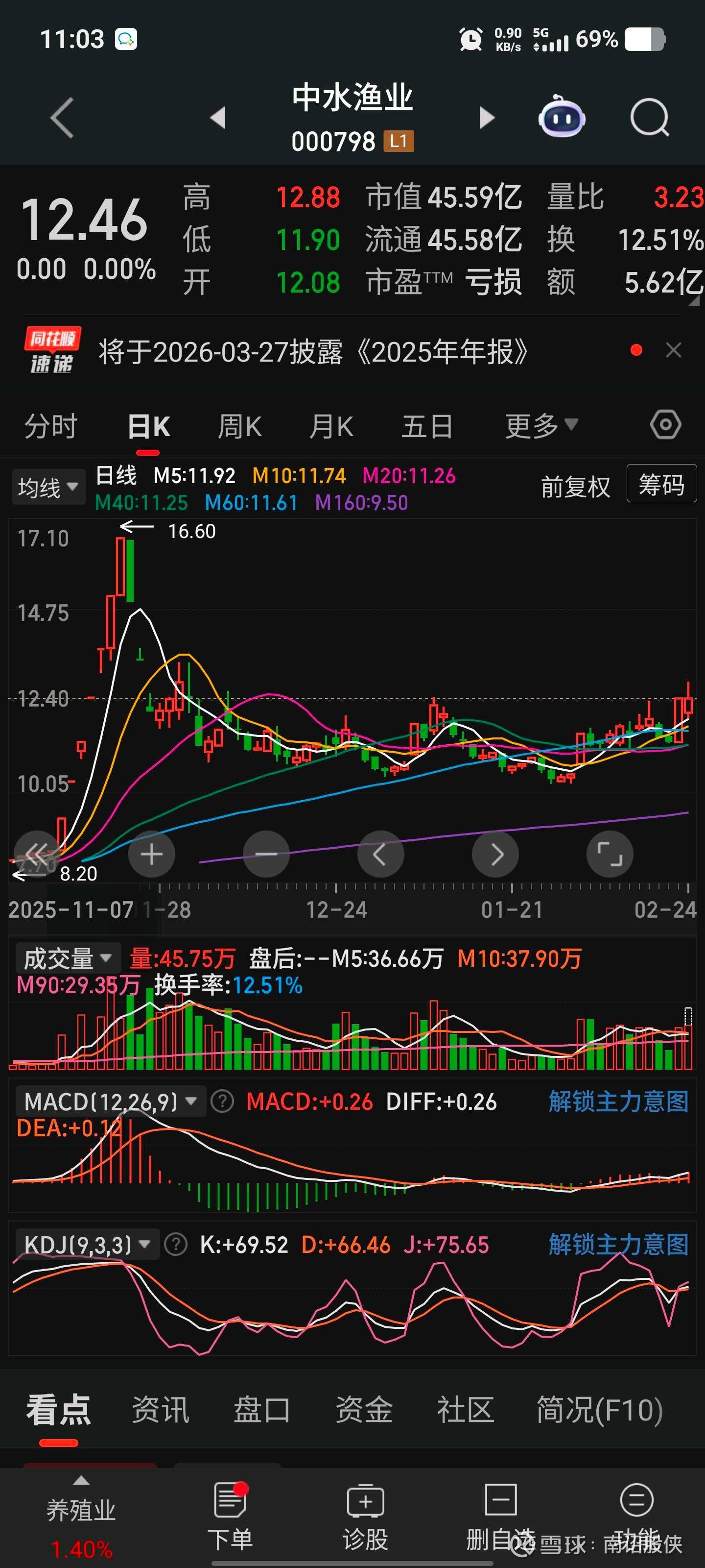 技术面:2025年11月份拉升出货以后,随后打下来吸筹2个多月 ,股东人数显示截止到1月31日,主力收走流通盘三成半的筹码。今日试盘颈线位12.48,如果站稳,将迎来一波连续上涨。这个位置潜伏性价比很高,积极参与。