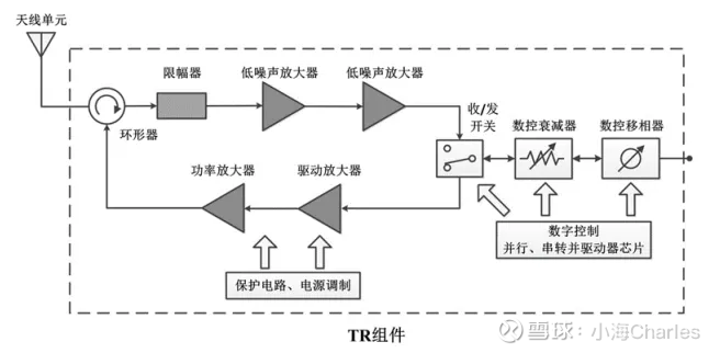 T/R组件(Transmit/Receive Module): 相控阵天线上每一个天线单元背后对应的“细胞”。其核心功能是:在发射时,将信号放大并馈送给天线辐射出去;在接收时,将天线收到的微弱信号进行低噪声放大。