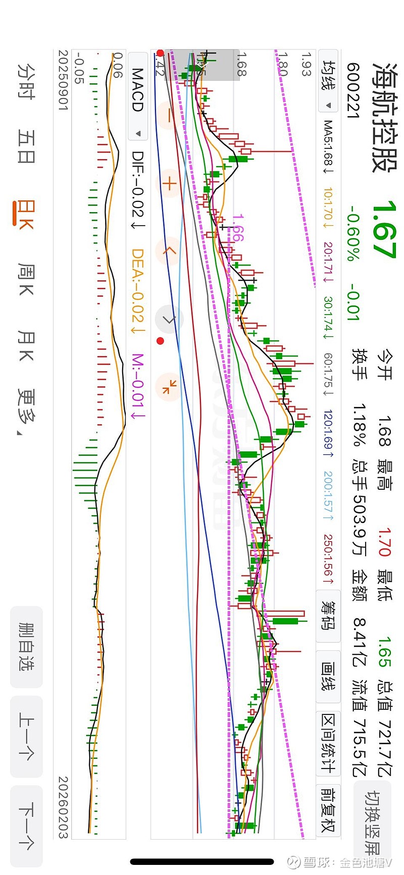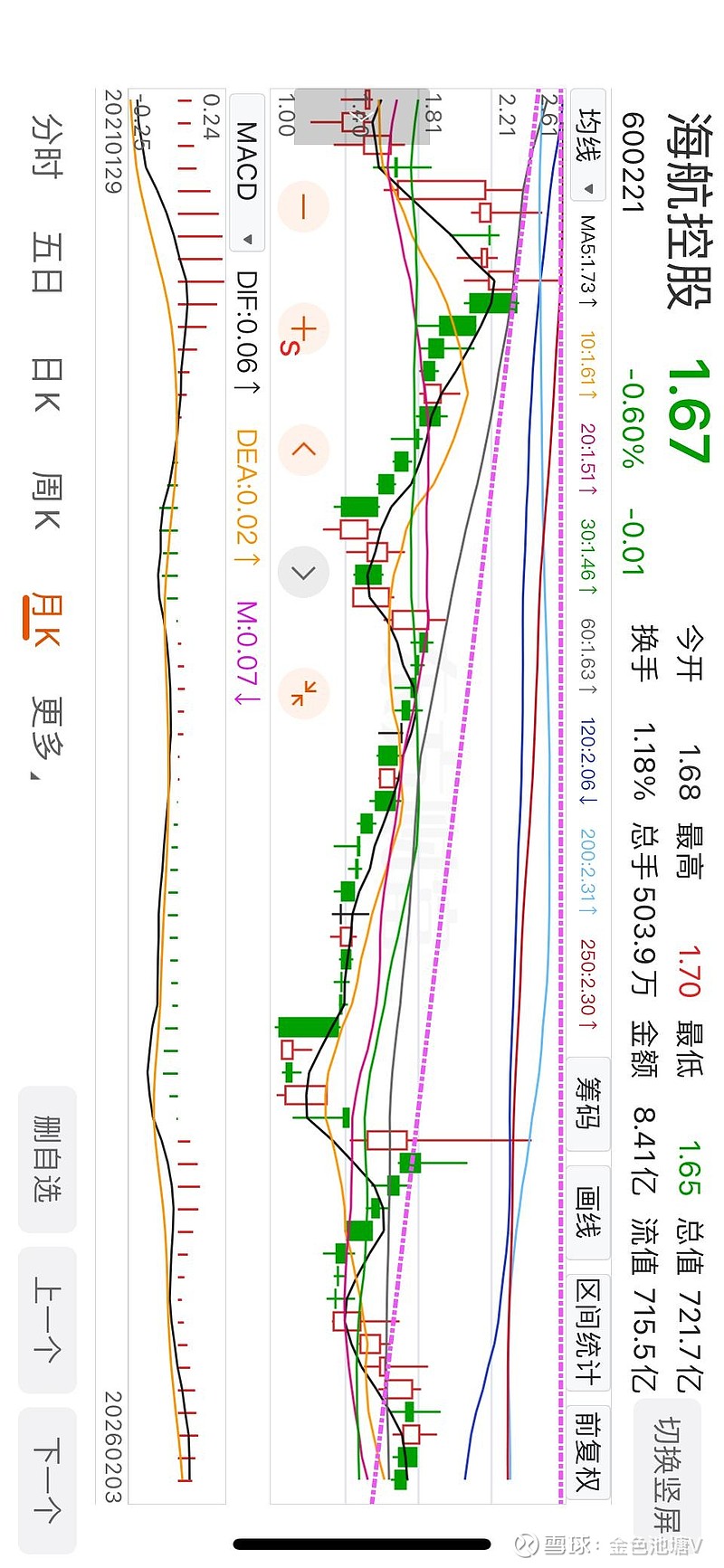 当初买入海航时,在1.65处设置了止损线,没想到今天盘中已经到了这个位置。但还没有机械性的卖出。这走势太离奇了,究竟是什么利空能让他如此一路下跌。之前担忧的伊朗发生战争风险目前也有缓和迹象,油价也开始回落至60美元附近,且人民币兑美元走势依然强劲,A股依旧在4000点上方。实在找不出什么利空的理由,难道是虽然盈利了但是未分配利润依旧是-700多亿,未来三十年可能看不到分红??但是看看人家$中国东航(SH600115)$ ,未分配利润-550亿,25年还续亏十七八个亿,股价不照样涨了45%+。