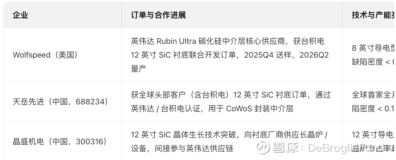一、核心衬底供应商(12 英寸 SiC 衬底,直接对接台积电 / 英伟达验证)