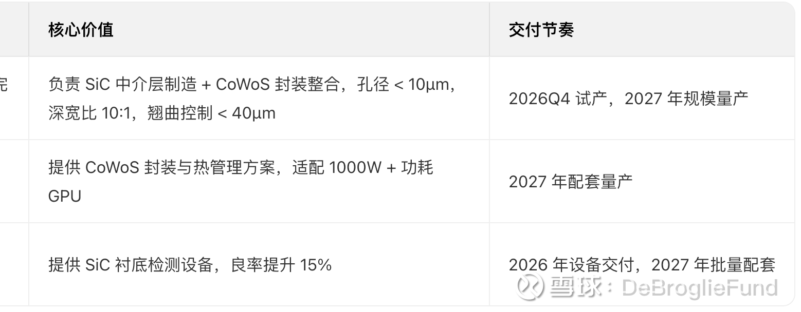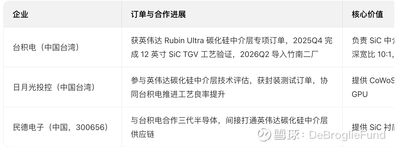 结论:碳化硅中介层订单集中在台积电主导的供应链,Wolfspeed 与天岳先进为核心衬底供应商,台积电 / 日月光负责封装制造,晶盛机电等通过设备间接参与。目前处于送样与小批量验证阶段,2027 年进入规模量产。