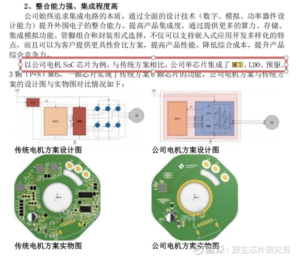 3. 《中微半导2024年报》中有云:“以公司电机 SoC 芯片为例,与传统方案相比,公司单芯片集成了 MCU、LDO、预驱、3 颗(P+N)MOS,一颗芯片实现了传统方案 6 颗芯片的功能”,说明其认为SoC是比MCU集成度更高的存在;