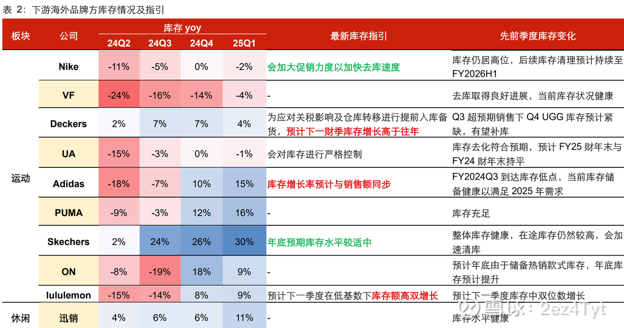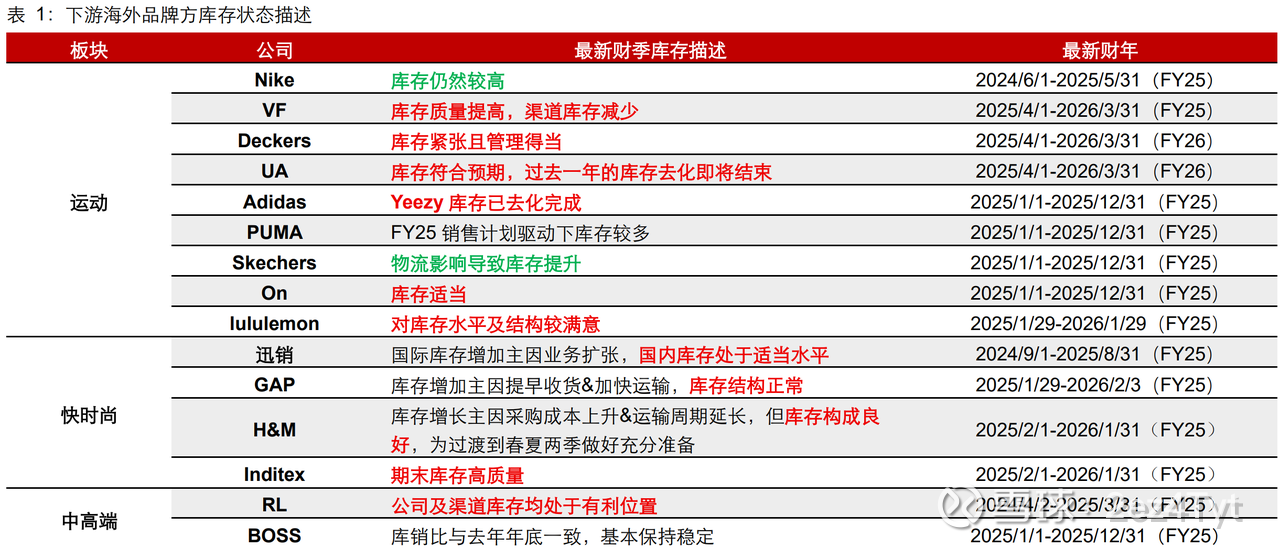 “展望品牌端后续库存走向,各公司呈现分化。Nike 与 Skechers 预计仍将延续去库, Adidas 与 lululemon 由于经营趋势向好,在积极的销售计划下预计延续主动补库, Deckers 则为应对关税影响及仓库转移进行提前入库备货,库存预计上行”。