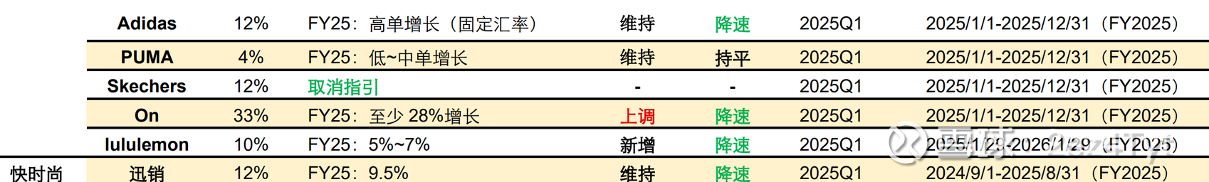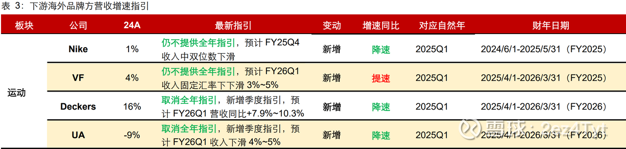 “从海外品牌最新营收增速指引来看,整体预期偏悲观,Adidas、PUMA、On、lululemon、迅销提供全年指引,其中仅 On 上调指引,其余为维持或新增,且各公司营收环比上一财年多为降速;Nike、VF仍不提供全年指引,Nike财季指引同比下滑;Deckers、UA、Skechers 首次取消全年指引,Deckers、UA 新增季度指引并均同比降速。综合来看,最新指引增 速普遍下滑且部分公司首次取消全年指引,美国下游品牌方对本财年订单指引趋于谨慎, 整体零售预期偏悲观”。