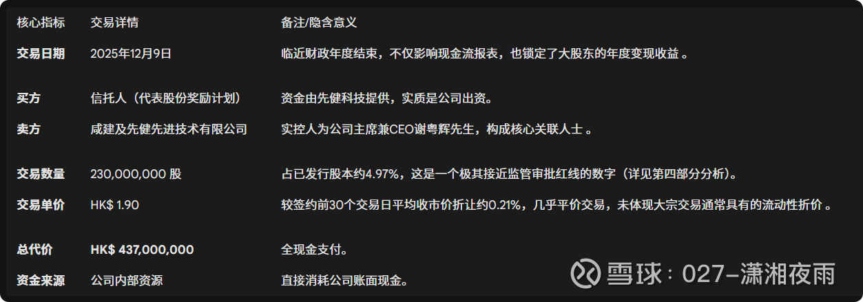 2025年12月9日,先健科技(以下简称“公司”或“先健”)发布公告,宣布受托人根据股份奖励计划,与卖方(由公司董事会主席谢粤辉先生控制的咸建及先健先进技术有限公司)签订协议,以每股1.90港元的价格购买2.30亿股公司股份,总代价约为4.37亿港元 1。该交易构成关联交易,且资金完全由公司内部资源提供。这是继2024年4月和6月之后,公司在短时间内第三次动用巨额现金从大股东手中购买存量股份用于激励计划 2。