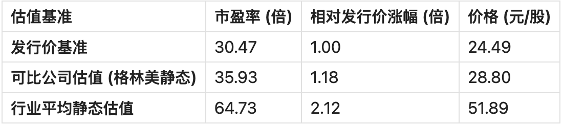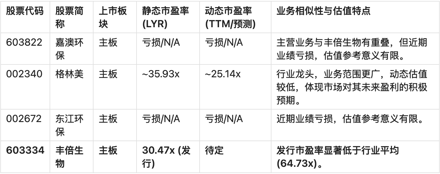 在首次公开发行(IPO)阶段,新股的发行定价通常基于其静态市盈率(P/E LYR),即以公司最新一期经审计的年度净利润计算的市盈率。对于丰倍生物而言,其30.47倍的发行市盈率是本次估值分析的基准。