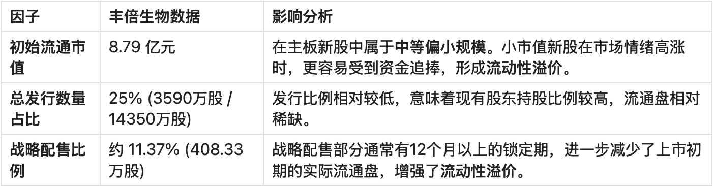 流动性溢价/折价评估:综合评估,丰倍生物的初始流通市值适中偏小,且战略配售和原有股东持股锁定了大量股份,导致上市初期实际可交易股份稀缺。预计丰倍生物在上市初期将享有显著的流动性溢价,这是推高其股价的重要驱动力。