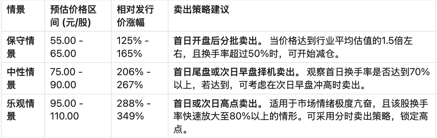 ·策略依据: 基于估值修复空间和市场情绪溢价,我们预估其中性卖出价格区间为75.00元/股至90.00元/股(相对发行价涨幅206% - 267%)。建议采用分时卖出策略,以锁定收益。