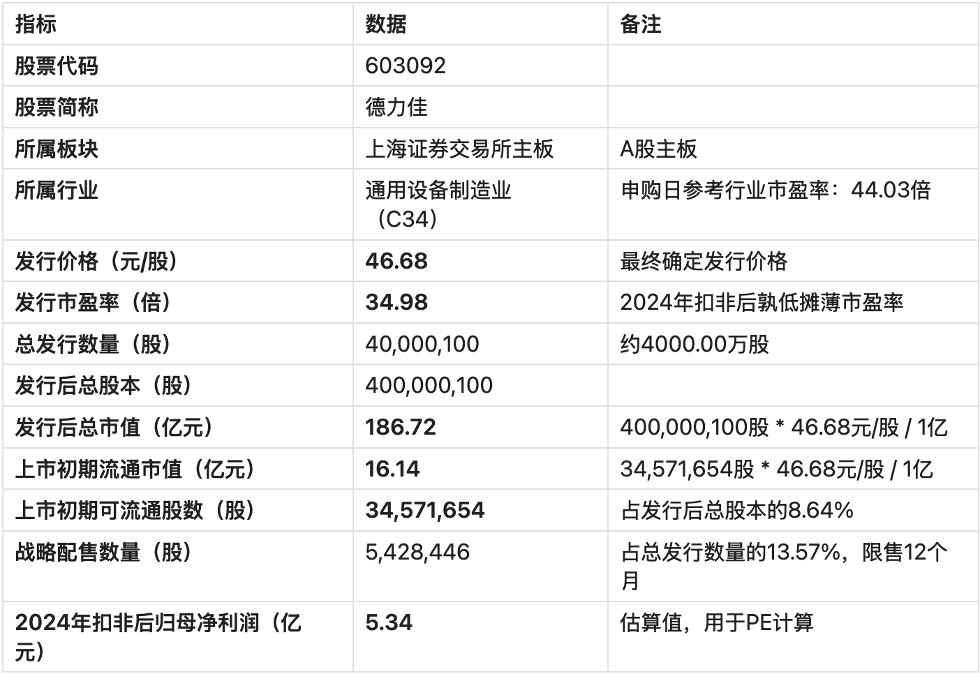 德力佳本次发行总股本为4000.00万股,发行后总市值186.72亿元。