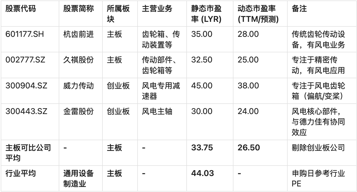 德力佳主营业务为风电齿轮箱,属于通用设备制造业。我们选择同行业及相关领域的公司作为可比对象,以便进行更全面的估值分析。