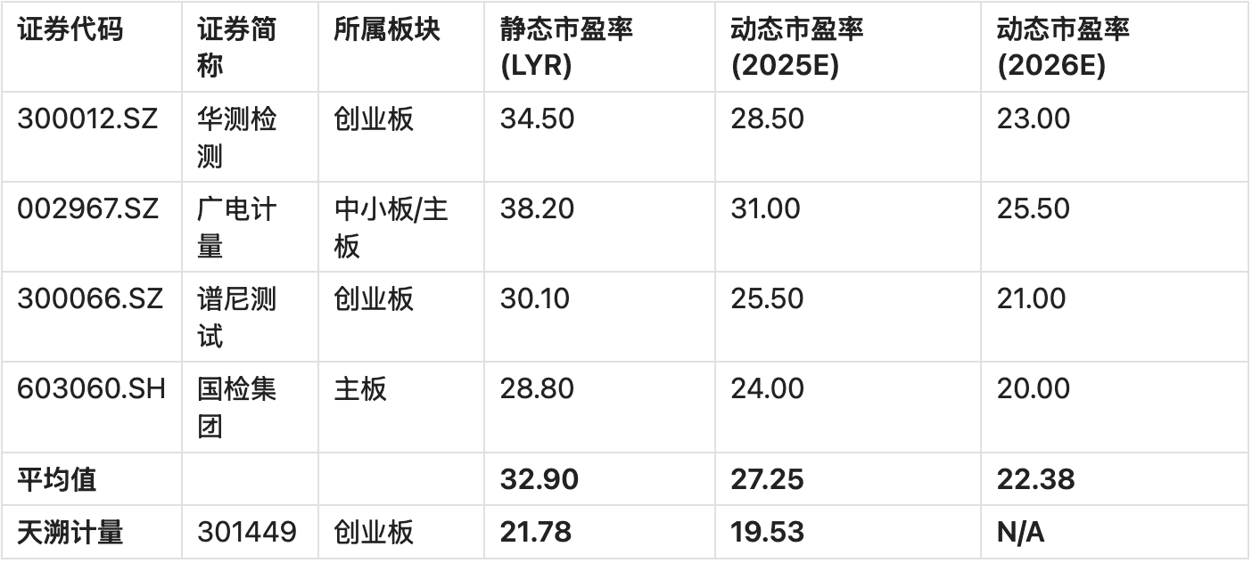 注:可比公司市盈率数据为截至2025年12月13日的市场数据,动态市盈率基于市场一致预期。天溯计量2025E动态市盈率基于公司预计净利润中位数1.225亿元计算(总市值24.00亿元 / 1.225亿元 ≈ 19.59倍,取19.53倍作为参考)。