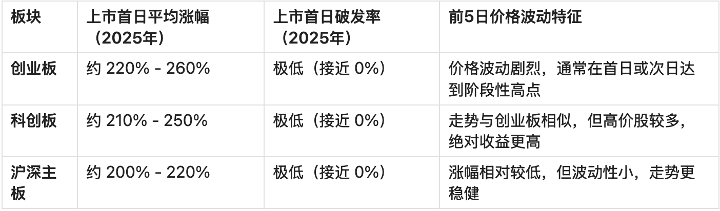 价格波动: 创业板新股在前5日无涨跌幅限制下,价格波动巨大。多数新股在上市首日即达到最高价,或在第2-3日完成主要涨幅。