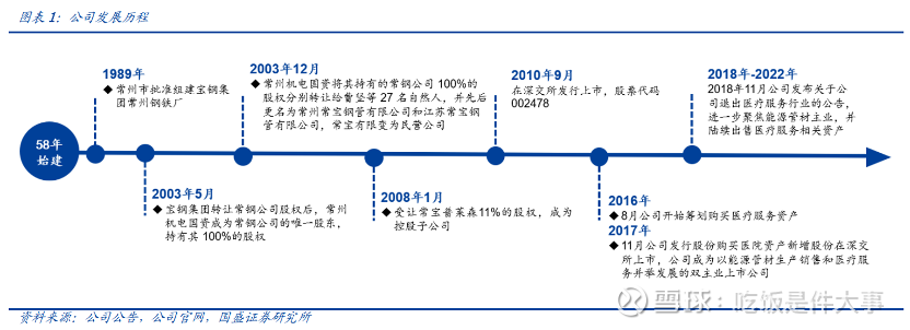 1、发展历史 江苏常宝钢管股份有限公司始建于1958年,1989年加入宝钢集团成为宝钢控股子公司。2000年,国家要求淘汰钢铁产业落后产能,公司也在淘汰名单之中,这导致其业绩面临严重威胁。2003年,宝钢在安置完职工之后,将公司转让给常州机电国资,后者又将股权转让给曹坚等公司骨干,实现民营改制。此后公司主营油套管与锅炉管的生产销售,于2010年在深交所上市。2016年,公司计划转型医疗服务,但已于2022年退出,回归特种管材这一主营业务。