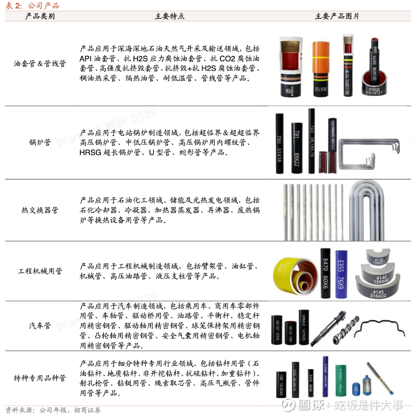 2、产品 常宝主营无缝钢管业务,这个市场的行业集中度较高,在国外,泰纳瑞斯、瓦卢瑞克、俄罗斯TMK三大企业瓜分了约70%的份额,而在国内,宝钢股份、中信特钢(天津钢管)、衡阳钢管等大企业则占据行业第一梯队。大型老牌无缝钢管企业在中高端规格产品上凭借其产能优势、成本优势、管理优势占了大部分份额,但考虑产品本身的经济效益,往往在高规格无缝钢管产品中投入的积极性不高 。常宝总资产规模较小、又是民营企业,与众多“巨无霸”正面抗衡并不明智,于是选择了中小口径特种专用管材这样一个小众但高规格的细分赛道进行深耕。时至今日,公司已经成为特种专用管材赛道的领军人物之一,公司及主要子公司是国家高新技术企业、国家专精特新小巨人企业、国家绿色工厂,公司的油管、小口径合金高压锅炉管、HRSG超长管、高压给水加热器用U型管等市场份额保持行业前列,具有较大的行业品牌知名度,具有较强市场竞争力。同时,公司开发石化专用管、工程机械及汽车精密用管等新产品,逐步形成新的特色增长点。