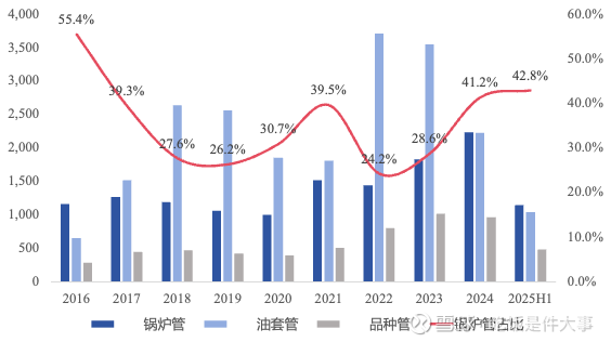 在众多产品中,油套管和锅炉管贡献了大部分营收。近几年受宏观经济及行业基本面影响,油气行业市场需求偏弱,但锅炉管行业需求旺盛,公司持续加大内部挖潜和内部资源协同,2025H1锅炉管营收占比42.8%,已成为公司第一大业务。从地区来看,海外营收基本与油套管营收同步变动,油气行业的弱需求导致意味着海外营收占比持续下降。
