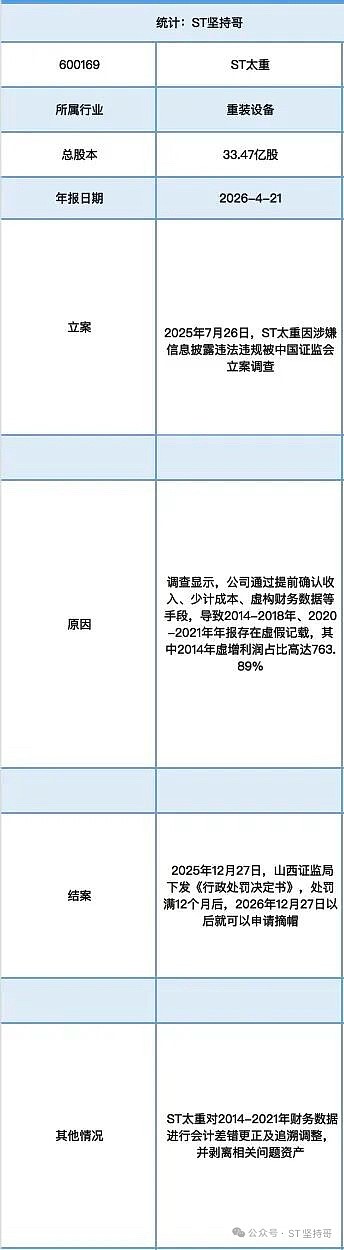 今天聊聊这个重装设备ST太重,2025年12月10日还增加商业航天这个新概念,ST太重从2025年7月26日被立案调查到2025年12月27日收到行政处罚决定书,处罚满12个月后,2026年12月27日以后就可以申请摘帽了