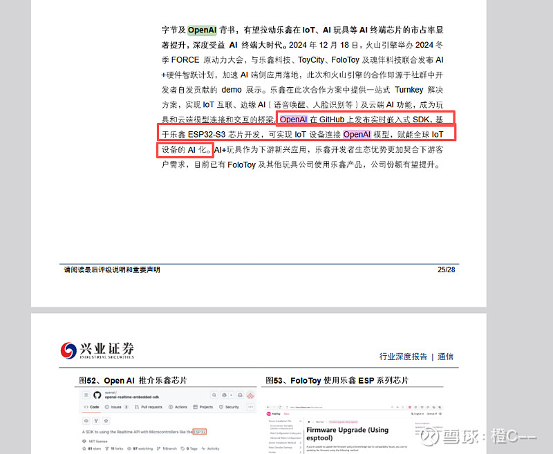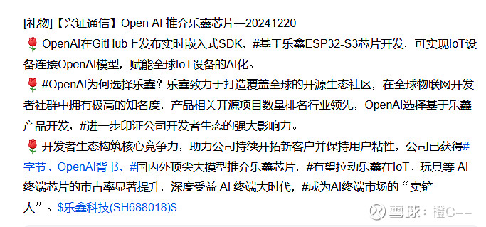 公司已获得#字节、OpenAl背书,#国内外顶尖大模型推介乐鑫芯片,#有望拉动乐鑫在I0T、玩具等 AI终端芯片的市占率显著提升,深度受益 A1终端大时代,#成为AI终端市场的“卖铲人。
