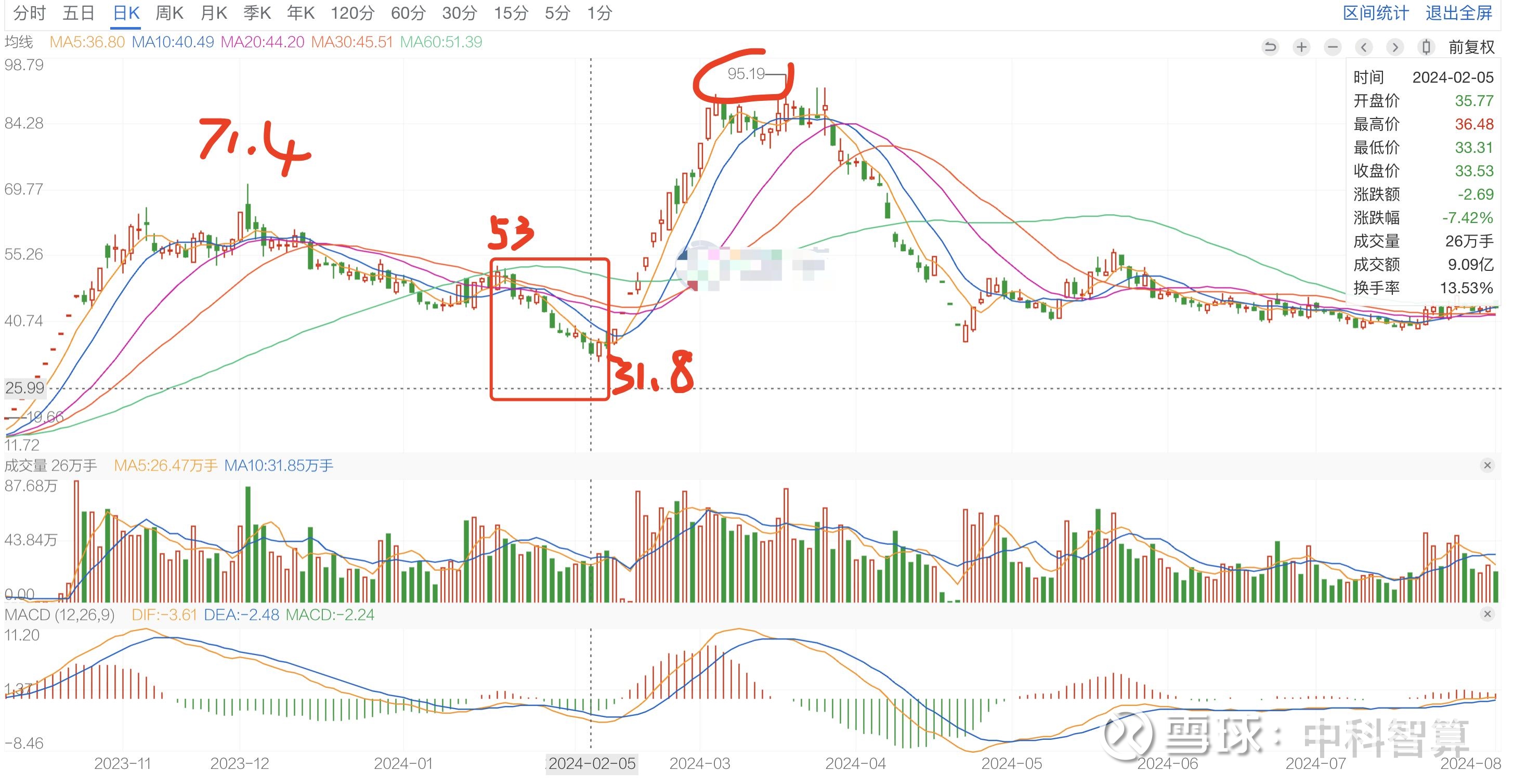第二波如上图,我认为从53之前的这些日线,都是出货的阶段,派发筹码回笼资金,给散户们发个小牌牌在50以上的均价上站好等着被洗。 从红框这个位置开始,就是砸盘逼着套牢在50以上的散户割肉交出筹码,从53这个高点,仅仅用了13个交易日砸到最低点31.8,下跌幅度40%,怎么个概念呢,平均每个交易日跌3%,连着跌俩周,这里面的韭菜们受到什么非人的折磨就不用描述了,大部分都缴枪割肉了吧,那时候正好赶上过年期间,不知道里面的小散们那个年是怎么过的。