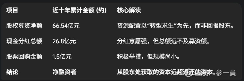 第四,是股东价值的“空心化”。过去十年,公司从股东处募集的现金远超其返还给股东的现金。大规模的增发导致总股本大幅增加,使每股收益的年均下滑速度远大于净利润的下滑速度,股东价值被严重稀释。
