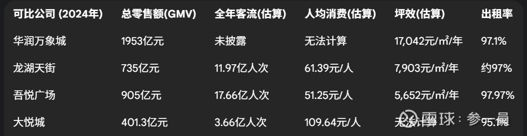 从可得数据看,华润万象城在高能级城市的布局使其坪效(单位面积产出)遥遥领先。大悦城则凭借其年轻潮流的定位,实现了最高的人均消费。龙湖和吾悦广场则以规模和稳定的高出租率取胜。