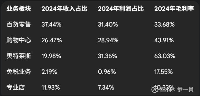 目前,公司的业务结构呈现多元化特征。根据2024年的数据,传统百货业务虽然仍在收入中占据最大份额(37.44%),但其主导地位已大幅削弱。购物中心(26.47%)和奥特莱斯(19.98%)已成为公司重要的收入来源。此外,公司正将以免税业务为代表的自营零售作为其未来的核心增长点,尽管目前其收入占比尚小(2.19%)。