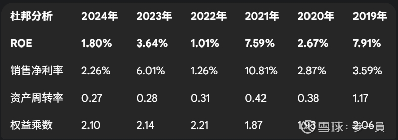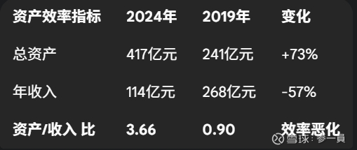 最主要的原因是资产周转效率的“塌陷”。公司的资产周转率从2019年的1.17次/年,断崖式下跌至2024年的0.27次/年。这意味着过去每1元的净资产能撬动1.17元的销售收入,而现在只能撬动0.27元。这一指标的急剧恶化,贡献了ROE下滑的绝大部分原因。其背后,是公司总资产因吸收合并和会计准则变更而大幅膨胀,而同期收入规模却因主业衰退而萎缩,资产效率被“双杀”。
