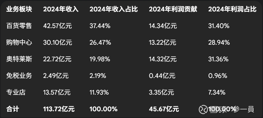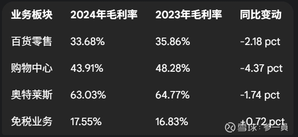 公司的战略叙事是“有税+免税”双轮驱动。但数据清晰地表明,当前真正驱动公司利润、支撑其渡过转型阵痛的,是“奥特莱斯+购物中心”这两个高利润引擎。2024年,奥莱和购物中心两者合计以不到47%的收入,贡献了公司超过60%的利润。它们是公司真正的“压舱石”和“现金牛”。相比之下,作为旧引擎的“百货”正在熄火,而作为新引擎的“免税”尚未能产生有效推力。这种“叙事与现实的错位”是理解公司价值的核心。