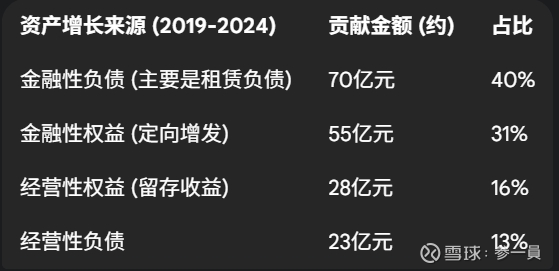 在2019年末至2024年末的五年间,公司总资产净增加了176亿元。这些增长的“来源”,主要依赖于“会计准则变更”带来的结构性调整(租赁负债,占比约40%)和“稀释股东权益”换取的外部资本(定向增发,占比约31%)。公司依靠自身盈利积累(经营性权益)所贡献的增长占比仅为16%,说明其内生性造血能力对支撑资产扩张的贡献非常有限。
