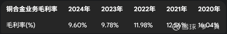 数据显示,公司“铜合金”产品的毛利率在近十年间整体处于个位数到百分之十几的区间,2024年为9.60%。这说明,尽管公司的高端化战略客观存在,但其在整体业务中的占比尚未能从根本上改变合金板块的盈利轮廓。