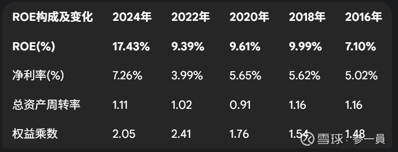 在2022年至2024年这个区间,公司实现了“高质量”的增长。在此期间,营业收入持续增长,ROE也从9.39%提升至17.43%。驱动这一增长的核心是净利率的大幅提升,同时公司的财务杠杆反而在下降(权益乘数从2.41降至2.05)。这表明公司的增长主要依赖于内生的盈利能力改善,而非外部的杠杆驱动,是一种较为健康的增长模式。