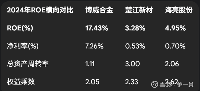 与此相反,博威合金的取胜之道在于“高净利、低周转”。其资产周转率远低于竞争对手,但凭借高达7.26%的净利率,最终实现了远超同行的ROE水平。