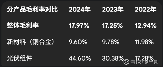 最核心的差异体现在两大业务板块之间。2024年,新材料业务的毛利率为9.60%,而光伏组件业务的毛利率则高达44.60%。这种天壤之别,是理解公司利润来源的关键。新材料业务的毛利率水平,与铜加工行业普遍的“加工费”模式相符,其盈利空间受到原材料成本和市场竞争的双重挤压。