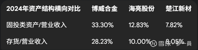 与海亮股份、楚江新材等以“贸易+高周转加工”为主要模式的同业相比,博威合金的资产明显偏“重”。2024年,公司的固投类资产与收入之比为33.30%,而海亮和楚江分别仅为12.83%和7.82%。同样,公司的存货与收入之比为28.23%,也显著高于两家龙头的10.00%和8.05%。