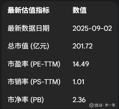 截至2025年9月2日,公司的总市值为201.72亿元,对应的市盈率(PE-TTM)为14.49倍,市销率(PS-TTM)为1.01倍,市净率(PB)为2.36倍。这一估值水平,反映了市场对公司未来发展的一种“中性偏乐观”的预期。