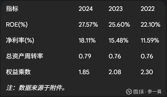 更值得关注的是其回报质量的提升方式。通过杜邦分析拆解可以发现,公司ROE的增长并非依赖于风险较高的财务杠杆。恰恰相反,在ROE持续攀升的同期,公司的权益乘数(衡量财务杠杆的指标)从2022年的2.30一路下降至2024年的1.85,显示公司正处于一个主动“去杠杆”的过程中。总资产周转率则基本保持稳定,维持在0.76至0.79的区间。