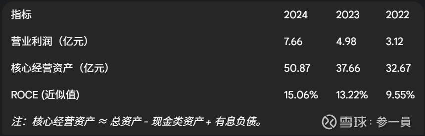 根据近似匡算,公司的ROCE从2022年的约9.55%提升至2024年的约15.06%。超过15%的ROCE是公司盈利效率的硬证据,显示其利用核心资产创造利润的能力较强。这一成果主要由产品结构优化带来的高净利率驱动,而非依赖财务杠杆或透支资产周转率。