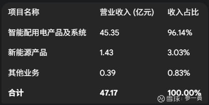 从业务构成来看,公司的绝大部分收入来源于“智能配用电产品及系统”这一核心板块,其收入占比超过了96%。同时,公司也在积极布局新能源业务,如充电桩、储能和微电网系统,但目前该业务板块的收入占比仍然较小,约为3%。