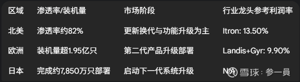 在这个全球市场中,竞争格局激烈。北美市场主要由Itron、Landis+Gyr等国际巨头主导。海兴电力的全球收入份额经测算约为0.23%至0.24%,体量尚小。但值得注意的是,得益于其高附加值的解决方案业务和海外布局,公司的利润率水平优于许多国内外同行,其“利润份额”可能高于“收入份额”。