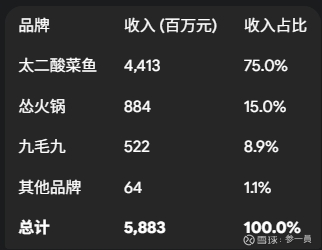 公司旗下拥有一个多品牌矩阵,其中,“太二酸菜鱼”是绝对的业务核心和主要收入来源。太二主打老坛子酸菜鱼,以其独特的品牌文化和年轻有趣的氛围吸引了大量年轻消费者。除太二外,公司还运营主打重庆火锅的“怂火锅”、提供西北菜的创始品牌“九毛九”,以及新推出的贵州酸汤火锅品牌“山外面”等。公司的收入主要来自线下餐厅的堂食服务,同时辅以外卖业务和少量零售商品的销售。