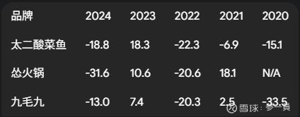 同店销售增长率是衡量一家连锁企业内生增长能力和品牌健康度的核心指标,它剔除了新开店带来的规模扩张影响,纯粹反映现有门店对顾客的吸引力。九毛九旗下各品牌的同店销售数据在近年呈现出剧烈波动,清晰地揭示了其经营面临的挑战。