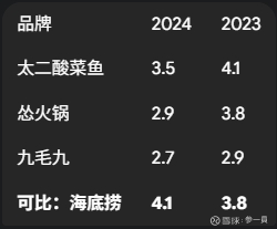 在这样的市场环境中,九毛九面临着激烈的竞争。其主要竞争对手是同样布局于购物中心的中式正餐和火锅连锁品牌。例如,旗下的“怂火锅”直接与行业标杆海底捞以及呷哺呷哺集团旗下的“凑凑”火锅在客流和定价上展开竞争。而“太二酸菜鱼”不仅要面对同类正餐品牌的竞争,还受到大量主打性价比的快餐式酸菜鱼品牌的挑战。
