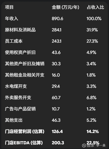 成本结构方面,原材料和员工成本是最大的两项支出,分别占收入的31.9%和27.3%。值得注意的是,与外卖业务相关的平台服务开支已成为一项重要成本,占总收入的6.8%。门店的租赁相关成本(主要体现为使用权资产折旧和其他租金)合计约占收入的6.7%。