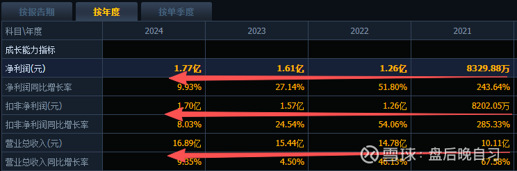 公司2021-2024年营收从10.11亿元增长至16.89亿元,归母净利润由8329.88万元提升至1.77亿元,净利润的年均复合增长率保持在20%以上。