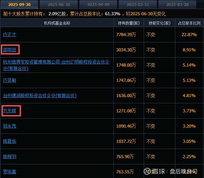 更值得重视的是, 公司十大股东中赫然出现邵雨田、方东晖两位顶级牛散。截至2025年9月末,邵雨田持有3034.3万股(占比8.91%),方东晖持有1271.08万股(占比3.73%),均为首发限售股。