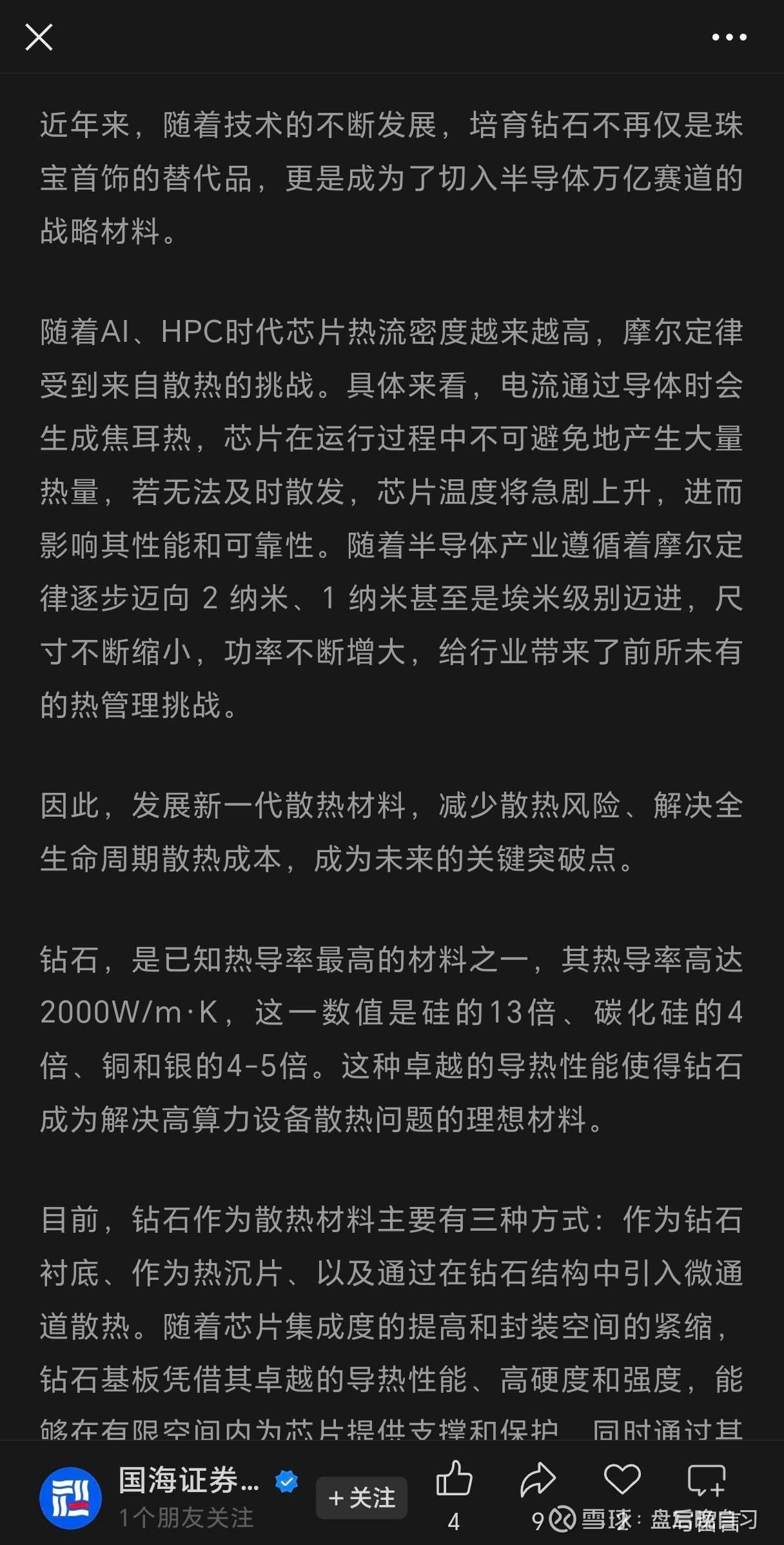 据国海证券研报预测,钻石散热市场规模将从2025年的0.37亿美元暴涨至2030年的152亿美元,渗透率从不足0.1%提升至10%,市场空间巨大。中国作为全球