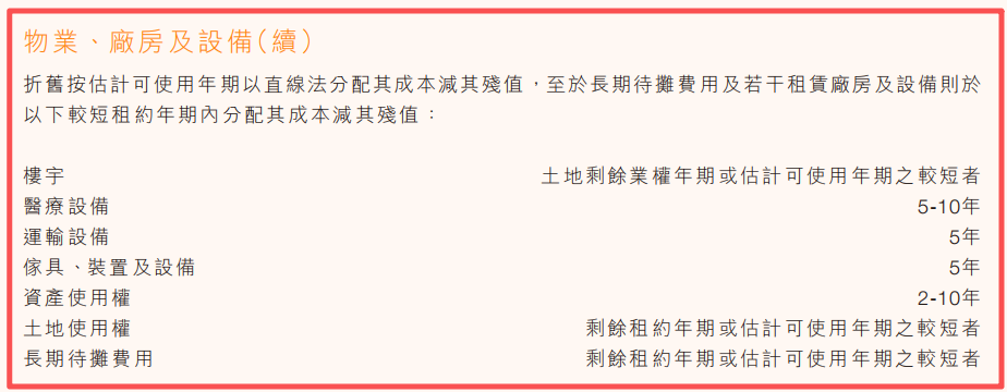 【注1】这些资产主要包括建筑物、医疗设备、办公物品等。不同资产的使用寿命差异极大,例如新的医院大楼可以用40-50年,旧楼只能用20-30年,而医疗设备可能5-10年就要更换(有些设备像冰箱洗衣机,可以用很久,有些则像智能手机,更新换代很快),办公物品(如电脑)寿命则更短。从资产价值来看,占大头的是建筑物,其次应该是医疗设备。加权平均的话,至少也能用26年吧。写26年只是为了好计算,加减两三年都无所谓。其实公司24年财报有提到各类资产的折旧年限(下图),但不够具体。