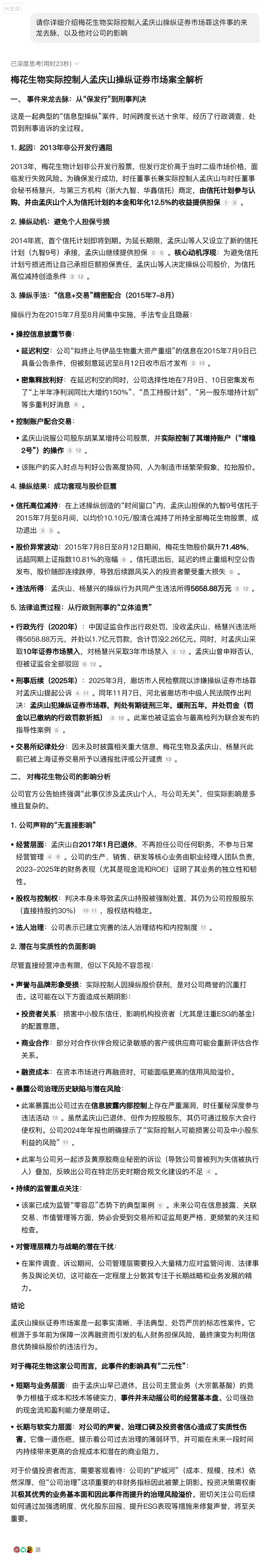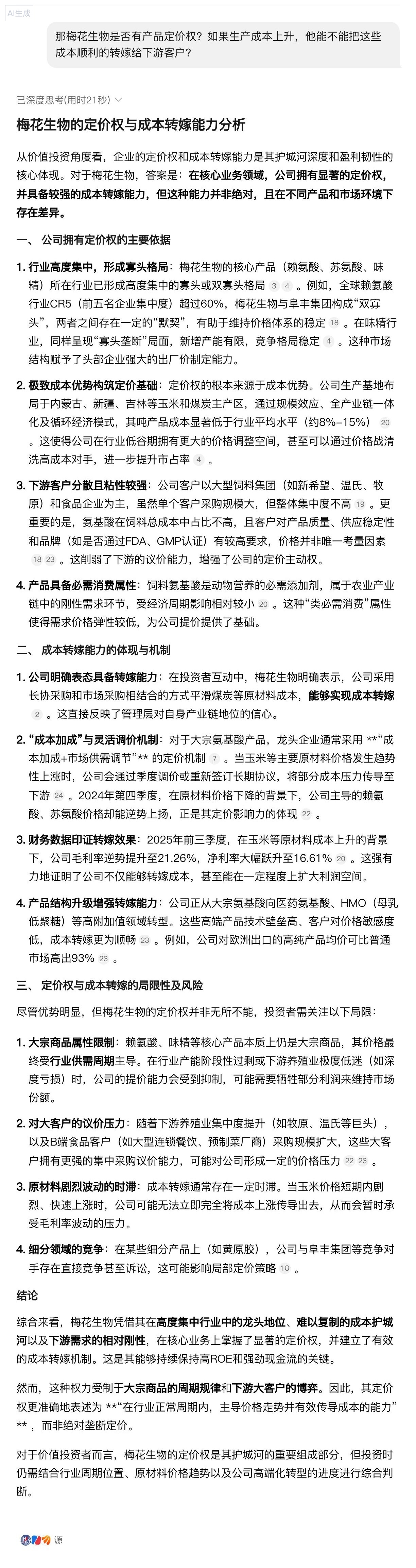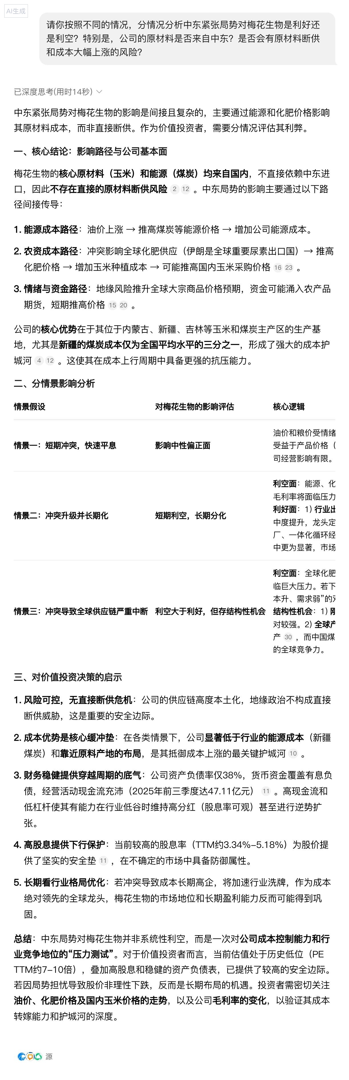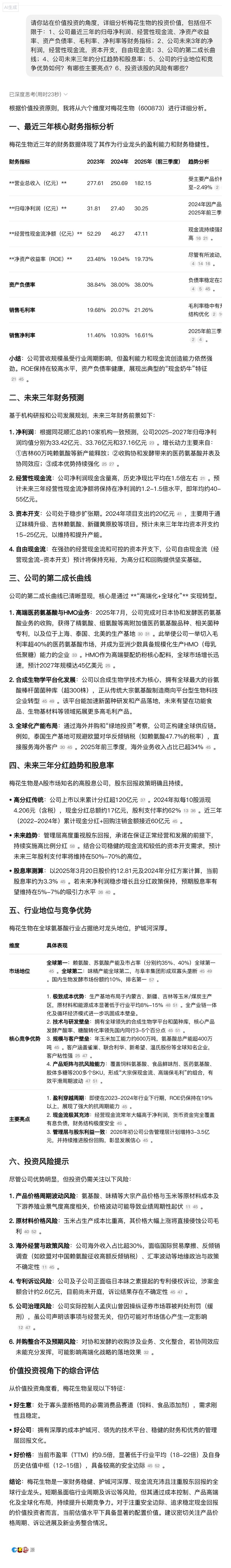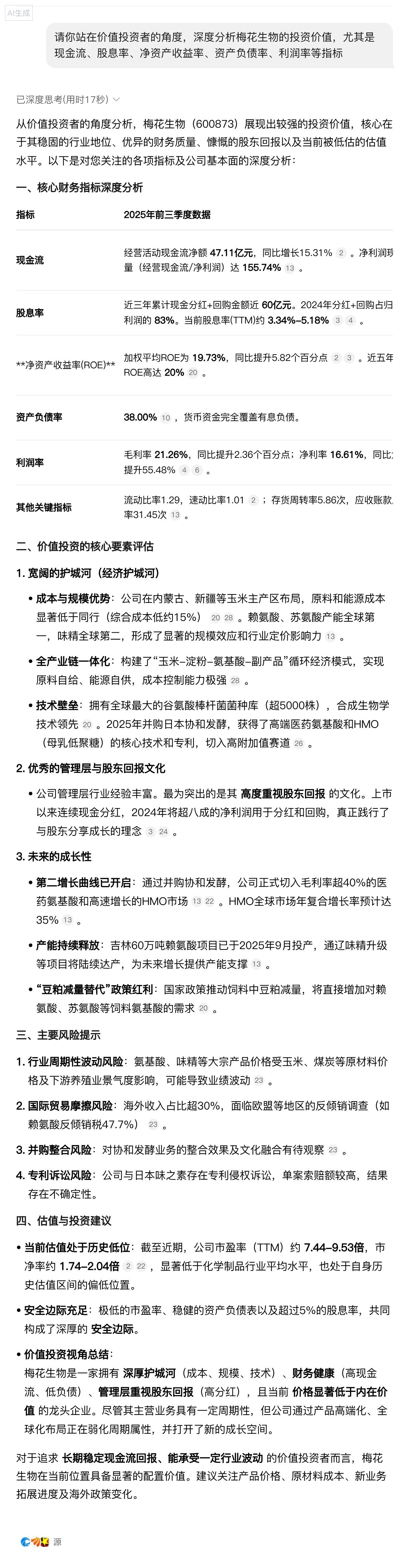 最近在筛选高股息率且低市盈率的公司时,发现了梅花生物这支股票。当时看了几个财务数据(净资产收益率、销售利润率、资产负债率、净利润现金含量等),觉得挺不错的,于是就用AI研究了一番。下面我把AI的分析截图发上来,以便自己查阅,也供大家参考。由于AI幻觉,有些数据和内容可能是不准确的,请谨慎使用。