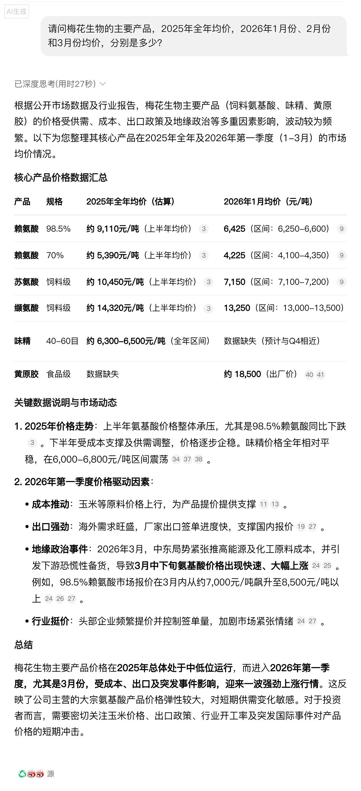 8、梅花生物主要产品2025年全年和2026年1-3月份每月均价;