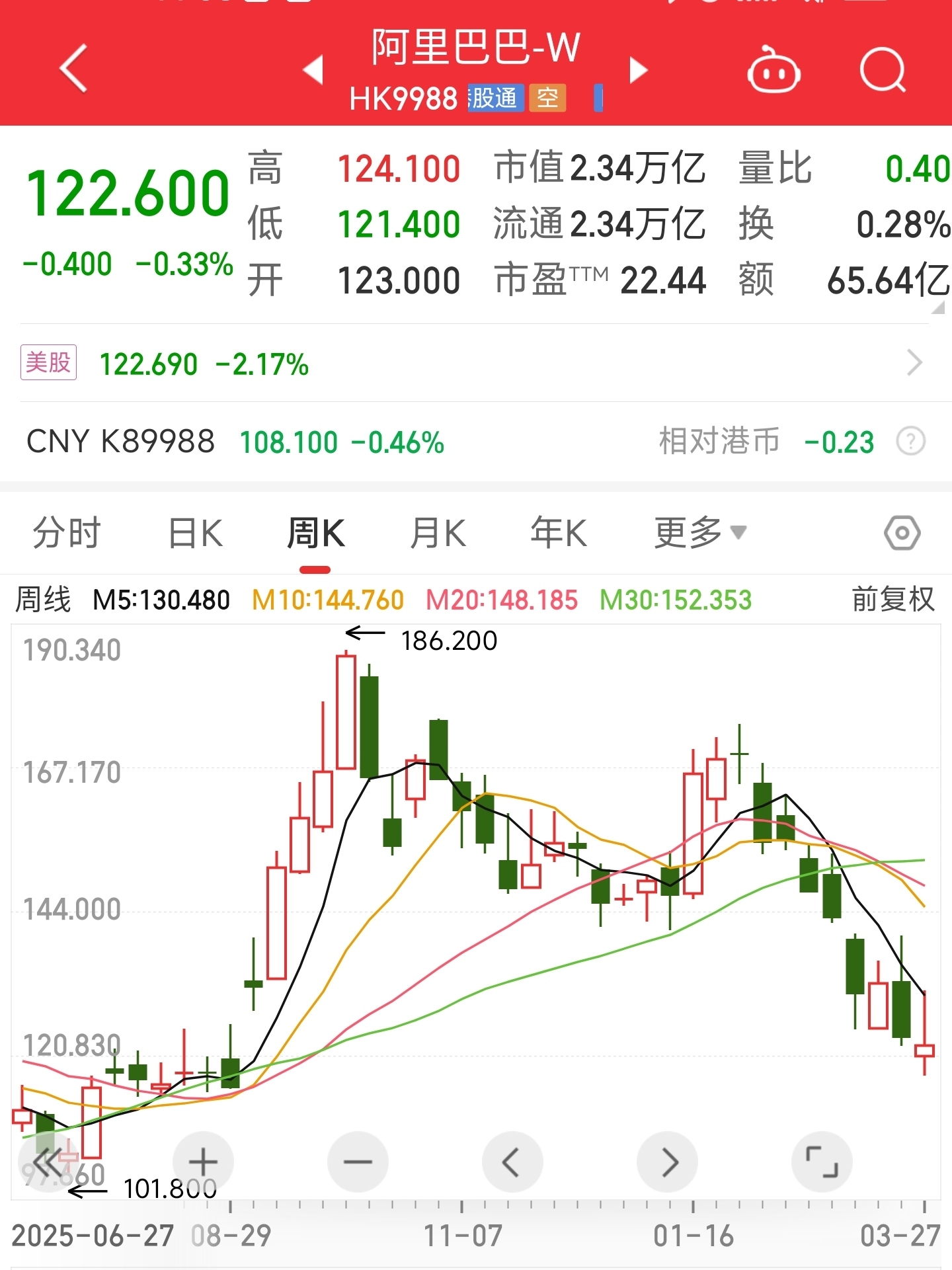 一月下旬我买了阿里巴巴,平均成本大约170港元,买完后便连跌几周,现在只有122了,可谓损失惨重。
